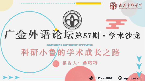 2023年5月16日晚19:00,我院广金外语论坛第57期·学术沙龙顺利在线举行,我院大学英语部鲁巧巧老师主讲,分享其课题申报、论文发表与海外申博的心路历程。