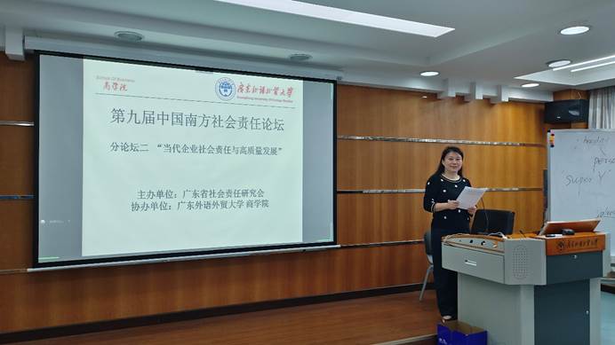 2023年12月,第九届中国南方社会责任论坛之分论坛二“当代企业社会责任与高质量发展”在广东外语外贸大学顺利举办。外文学院刘晓琴博士应邀主持了上半场分论坛。此次分论坛汇聚了研究企业社会责任的部分专家学者,大家深入研讨了一系列关键议题,为企业社会责任的未来发展描绘了精彩的篇章。