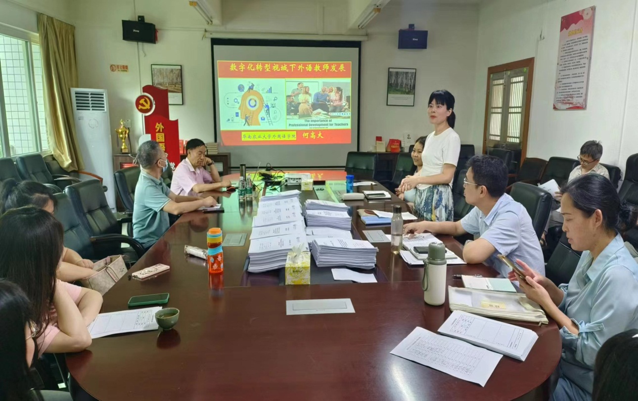 讲座上,何教授以“数字化视域下外语教师专业发展”为题,结合当前大语言模型背景,分享了教育数字化转型视域下外语教师专业发展的“7P+7C+8C+8Q”思维导图,鼓励老师们要与时俱进,提升增强数字素养、数据意识、跨界意识,提高时间管理能力、终身学习能力、管理能力、沟通能力、跨界合作能力,借助外语教学技术强教、强学,实现更好职业发展,促进外语教学数字化转型。