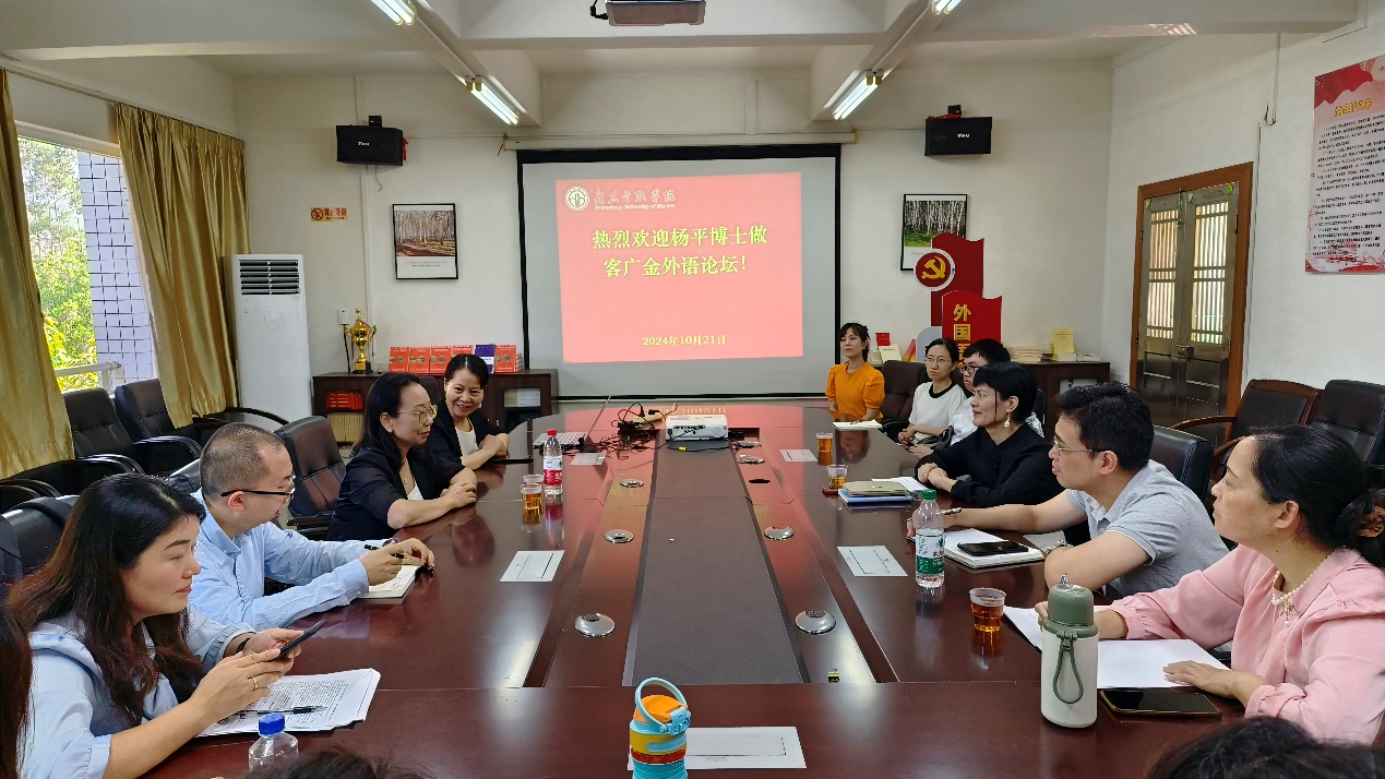 10月21日上午,《中国翻译》杂志主编、中国翻译研究院副院长杨平博士莅临我院,在外文学院的会议室2417与学院领导及部分教师进行了主题为“漫谈研究论文选题及其它”的精彩座谈。