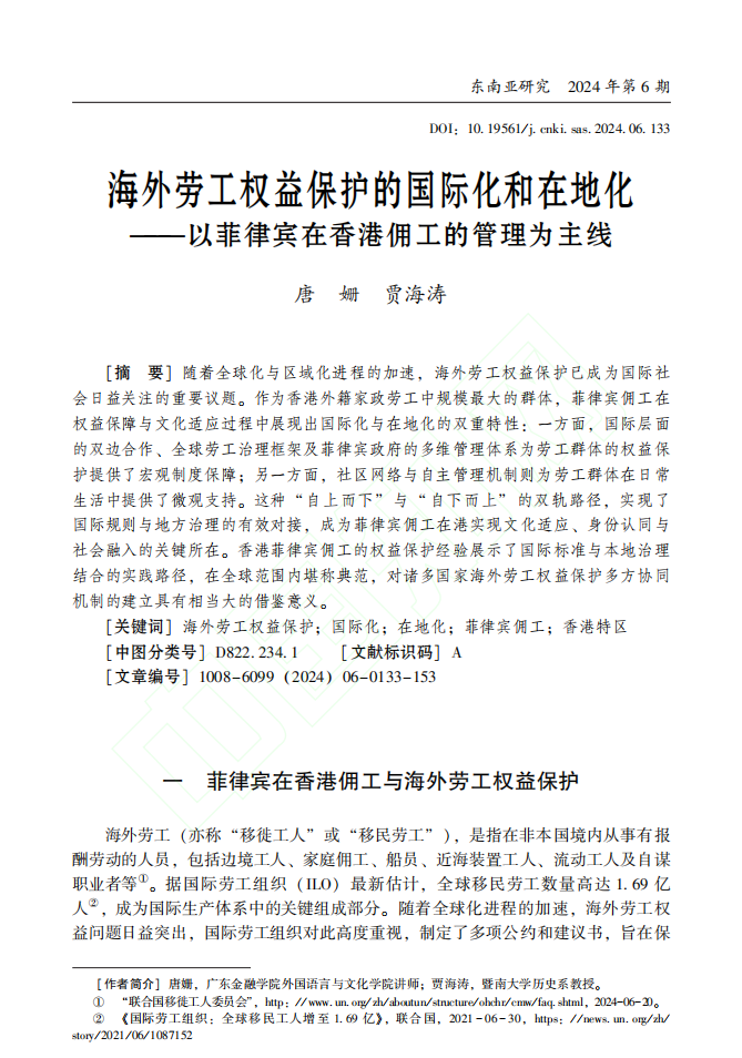 近日,yl9193永利集团唐姗博士在国内区域国别研究领域权威期刊《东南亚研究》上发表了题为《海外劳工权益保护的国际化和在地化——以菲律宾在香港佣工的管理为主线》的学术论文。