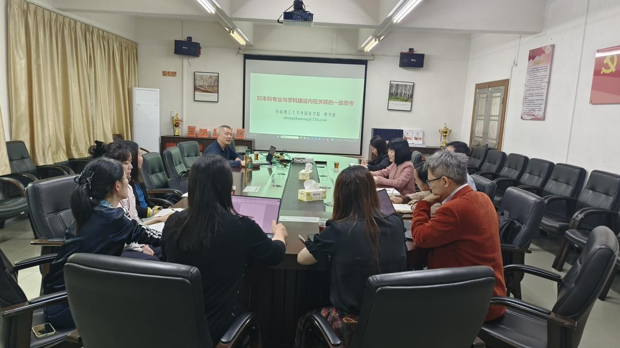4月7日,华南理工大学外国语学院钟书能教授应邀来我院座谈,围绕“对本科专业与学科建设内在关联的一些思考”这一主题进行学术交流。本次座谈会由涂兵兰院长主持,洪溪珧、陈树坤、甘容辉副院长,各系主任及科研骨干教师共同参与。
