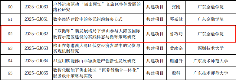 在2025年度佛山市社科规划课题项目的评审工作中,yl9193永利集团的鲁巧巧副教授成功获批立项。鲁老师主持的项目名为“双循环新发展格局下佛山参与大湾区国际教育示范区建设的实践样态与循环策略研究”(项目编号:2025-GJ062)。