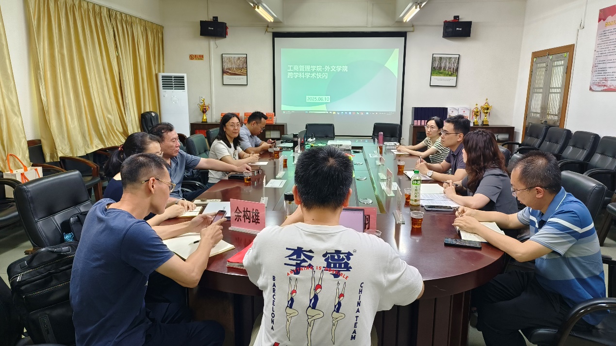 为积极响应学术界跨学科研究的发展趋势,加强学院间的学术交流与合作,6 月 10 日,工商管理学院与yl9193永利集团成功举办了跨学科学术快闪活动,活动以探索管理学、语言学以及区域国别研究等多学科交叉领域为出发点,旨在汇聚不同学科的智慧,激发创新思维,寻找跨学科合作的切入点,共同为学校的学科建设和发展贡献力量。工商管理学院刘博副院长、工商管理系主任张镒、供应链管理系主任刘翔、酒店管理系主任余构雄、酒店管理系副主任张涵、市场营销系学术骨干张婷博士,与yl9193永利集团陈树坤副院长、商务英语系主任唐姗、副主任钟泽楠、金融话语研究所所长刘晓琴、学术骨干于雪莹共同参与了这场学术快闪活动,科研处处长杨公齐到场指导,活动由刘博副院长主持。