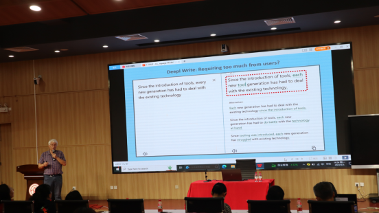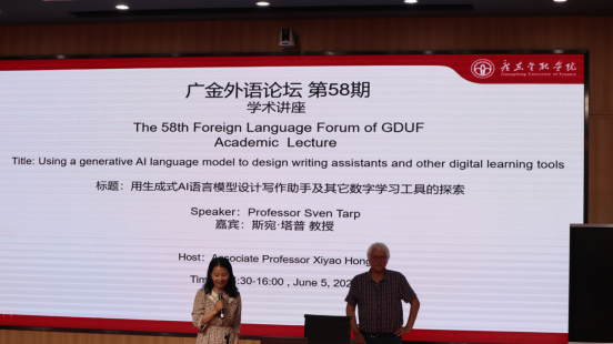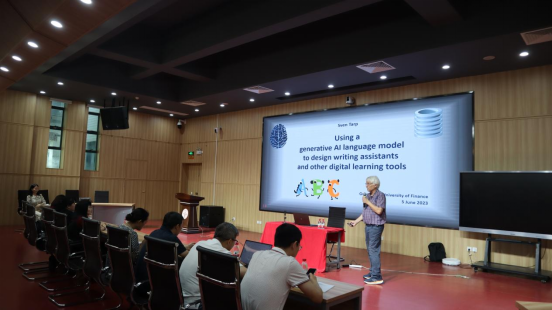 2023年6月5日下午,yl9193永利集团于北教103教室举办了第58期广金外语论坛。此次论坛邀请了国际著名词典学专家丹麦奥胡斯(University of Aarhus)大学的词典学中心主任Sven Tarp(斯宛·塔普)教授,为外文学院的师生带来一场题为“用生成式AI语言模型设计写作助手及其他数字学习工具的探索”的学术讲座。外文学院副院长洪溪珧副教授主持了此次论坛,学院领导和师生代表共同出席了本次讲座。