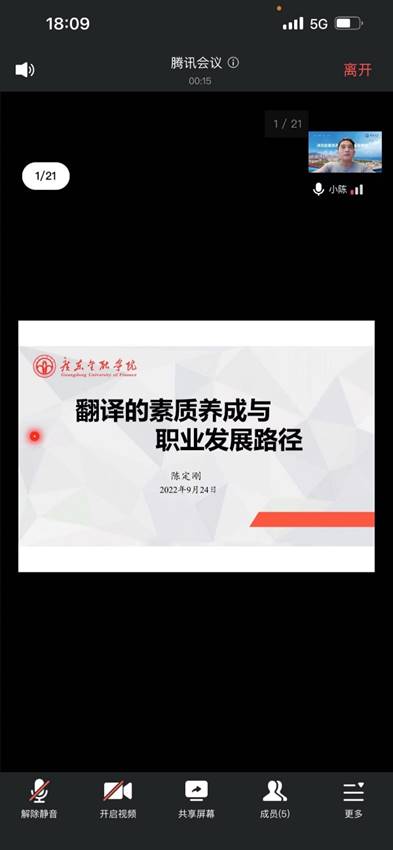 主讲人介绍:陈定刚,博士,译审。广东外语外贸大学高级翻译学院毕业。现为广东省科协委员,广东省翻译协会秘书长,中国翻译协会理事,广东省翻译专业人员高级职称评委会办公室主任,韶关市重大行政决策咨询论证专家。暨南大学、华南师范大学、海南师范大学等高校翻译硕士研究生兼职指导教师;2021年担任教育部学位中心组织的全国翻译专业学位水平评估专家。在国内外出版论文、专著、译著(含参译)40多篇/部;主持或参与省、校级课题/项目6项。主要讲授《金融英语》、《金融翻译》等课程。