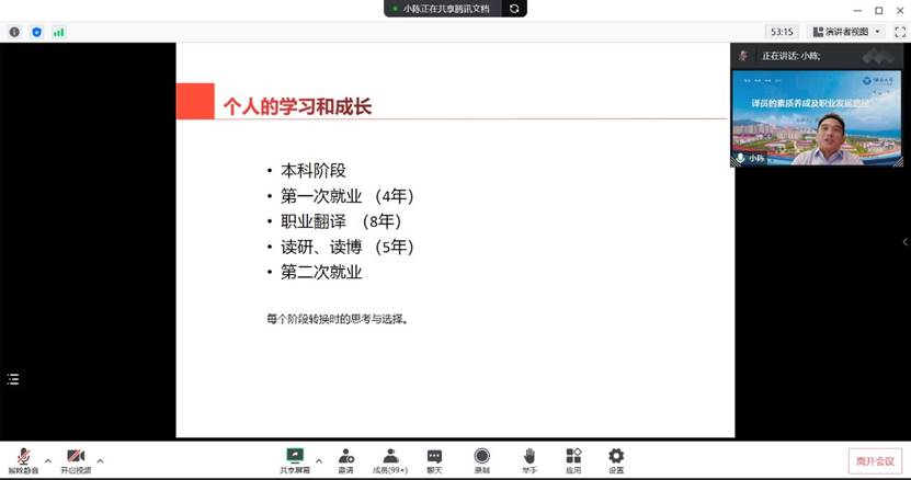 陈博士首先分享了个人在语言和翻译方面的学习和成长经历,并结合自己从宝洁等外资企业工作到职业翻译、再从职业翻译到翻译考研读博、再到翻译行业管理和翻译教育的三次转变,强调坚持学习、努力实践和持续积累对于翻译专业学生的重要。