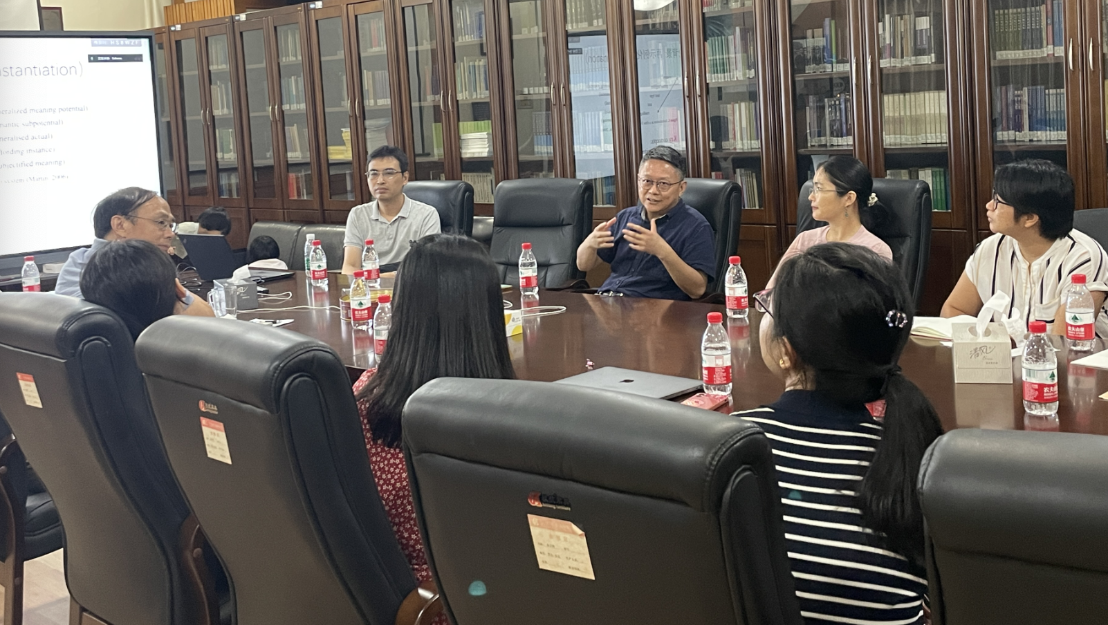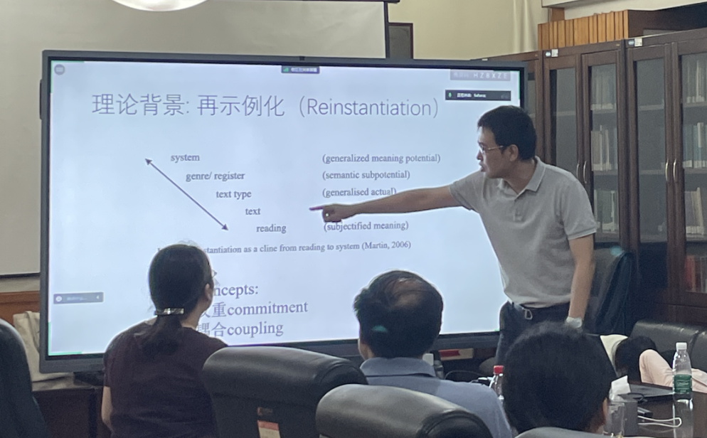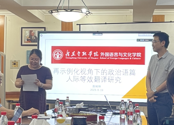 2023年9月19日下午,“韩礼德文献中心学术沙龙”第四期在外国语学院韩礼德文献中心(外国语学院222室)成功举办。我院翻译系陈树坤博士应邀作客沙龙主讲,讲座主题为“再示例化视角下的政治语篇人际等效翻译研究”。中山大学王勇教授、常晨光教授,华南农业大学杨曙教授,澳门大学王博助理教授,香港理工大学马园艺博士以及多位中山大学、广东外语外贸大学在读博士生参加了此次沙龙。沙龙由中山大学功能语言学研究所主办,中山大学陈静副教授主持。