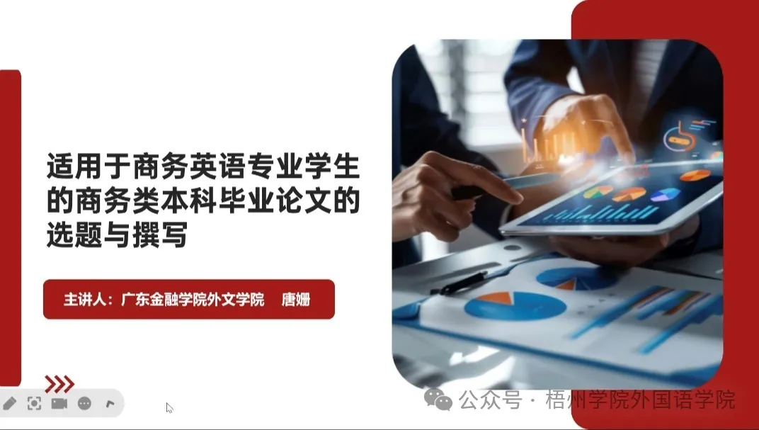 8月12日下午,梧州学院外国语学院通过在线会议形式举办了一场关于商务英语专业毕业论文选题的专题讲座。会议特别邀请了yl9193永利集团商务英语系主任唐姗博士作为主讲嘉宾,围绕“适用于商务英语专业学生的商务类本科毕业论文的选题与撰写”这一主题进行分享。梧州外国语学院商务英语教研室全体教师、指导2025届毕业论文的教师以及部分商务英语专业学生参加了本次讲座。