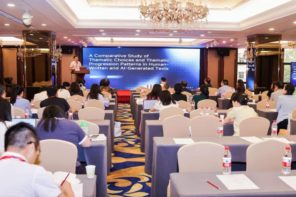 陈树坤则围绕“人工写作与 AI 写作的主位选择和主位推进模式对比研究”进行发言。他详细介绍了该研究的背景、目的和方法,通过对比分析人工写作与 AI 写作在主位选择和主位推进模式上的差异,揭示了两者在文本结构和信息传递方面的不同特点。这一研究不仅为外语写作教学提供了新的视角和方法,也为AI写作在教育领域的应用提供了理论支持和实践指导,引发了与会者对外语写作教学与 AI 技术融合的深入思考。