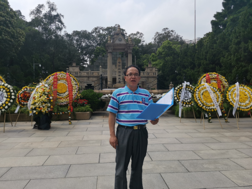 在致辞环节上,黄中习院长引用革命先烈黄兴所作的黄花岗烈士挽联——“七十二健儿,酣战春云湛碧血;四百兆国子,愁看秋雨湿黄花”,介绍黄花岗起义革命意义,嘱托同学们要缅怀革命先烈,铭记历史使命,牢记民族英雄作出的贡献,学习革命先烈们的无私奉献精神,不忘初心,牢记使命,学“四史”,知党恩,跟党走,为实现新时代中国特色社会主义中国梦不断拼搏,去开阔美好幸福的未来。黄中习还赋诗一首,与同学们共勉:初夏又见艳阳天,烈士碑前忆昔年。“浩气长存”光闪闪,杰雄苦战血斑斑。黄花岗上英魂泣,珠江岸边烽火燃。今朝神州小康日,怎能忘却福之源?