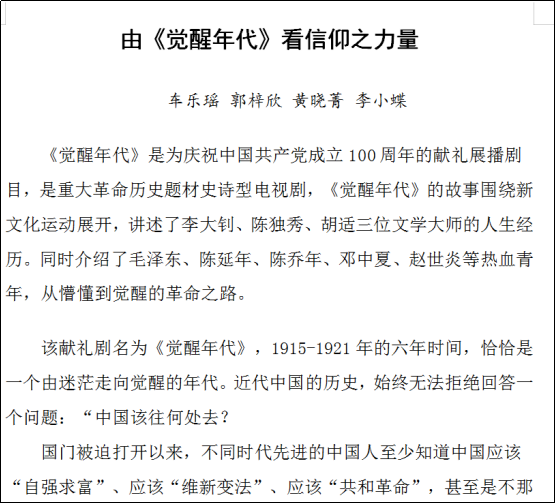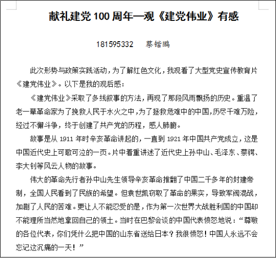 不忘历史,展望未来。此次党史学习教育系列活动,让学生们更加深刻体会“不忘初心、牢记使命”这句话的重量,也让我们更加明白这盛世的来之不易,珍惜着祖国的大好河山,从而激励学生们努力成为能担任民族复兴大任的时代新人。该活动不仅仅在于给党献礼,表达我们对党的热爱与崇敬,更是我们送给自己的一份真挚而热切的红色礼物。历史的接力棒依然交到青年们的手中,带着这份大国梦,继续努力而坚定地走下去吧!