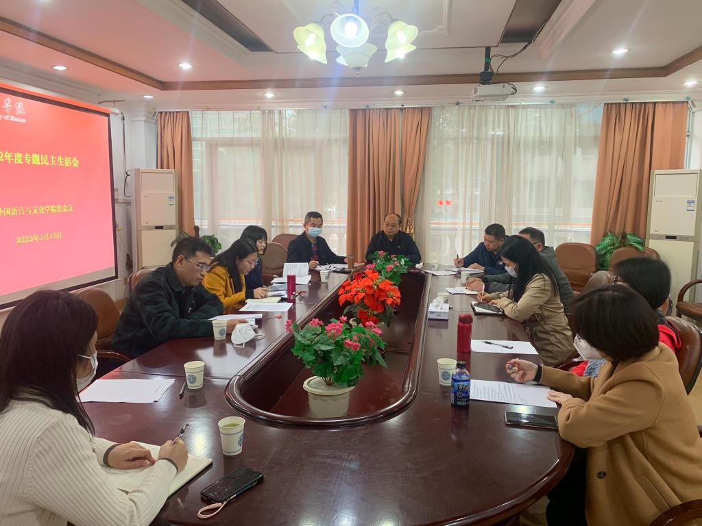 按照学校统一部署要求,1月15日,外文学院党总支班子召开2022年度民主生活会,以全面贯彻习近平新时代中国特色社会主义思想,深刻领悟“两个确立”的决定性意义,增强“四个意识”、坚定“四个自信”、做到“两个维护”,团结带领党员干部群众以奋发有为的精神贯彻落实党的二十大作出的重大决策部署为主题,紧密联系外文学院党总支班子工作,联系带头做到“两个维护”、带头用习近平新时代中国特色社会主义思想凝心铸魂、带头坚持和加强党的全面领导、带头坚持以人民为中心的发展思想、带头发扬斗争精神、带头落实全面从严治党政治责任等方面的实际,认真查摆、深刻剖析,开展批评和自我批评,提出改进措施,明确努力方向。学院党总支书记黄庆雄主持会议并作总结讲话。学校雍和明校长到会指导,并进行了点评。学校校长办公室主任杨叶坤陪同参加。