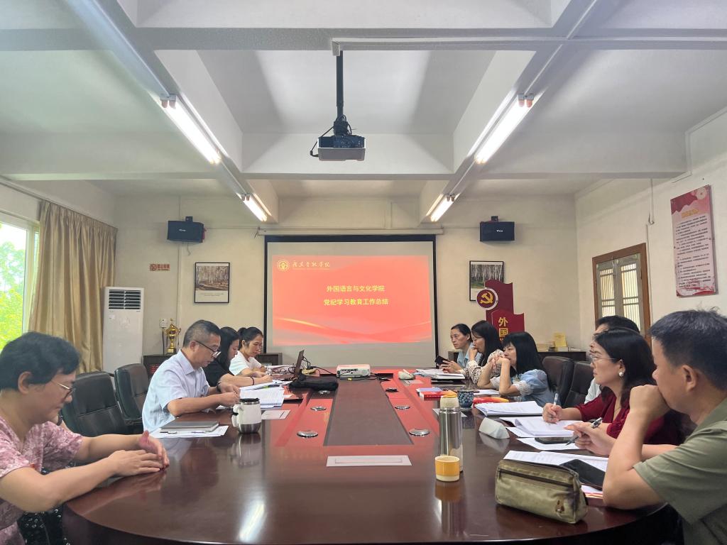 9月14日上午,外文学院党委在学院会议室2417召开了党纪学习教育总结会。学院党委书记黄庆雄、党委副书记、院长涂兵兰及学院党纪学习教育专班全体成员参加。会议旨在回顾和总结外文学院党纪学习教育的开展情况,分析存在的问题和不足,并探讨如何将党纪学习教育的成果转化为推动学院高质量发展的强大动力。