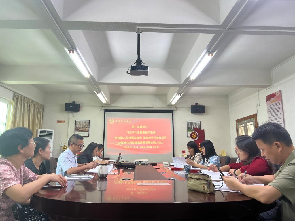 最后,黄庆雄书记对学院党纪学习教育进行总结。他指出,自学校四月份开展党纪学习教育以来,学院按照学校党委统一部署要求,深入学习贯彻习近平新时代中国特色社会主义思想,特别是习近平总书记关于党纪学习教育的重要讲话和重要指示精神以及中央党的建设工作领导小组会议精神和《中共中央办公厅关于在全党开展党纪学习教育的通知》精神,贯彻落实中央决策部署及省委和学校党委具体要求,将党纪学习教育作为学院加强党的纪律建设、做到“学纪、知纪、明纪、守纪”,推动全面从严治党向纵深发展的重要举措。学院通过精心组织、周密部署,在加强理论学习、强化实践锻炼、发挥先锋模范作用、创新工作方法等方面取得了显著成效。他强调,党纪学习教育是一项长期而艰巨的任务,学院党委将继续高度重视、认真组织、扎实推进。他要求全体党员干部要坚持以习近平新时代中国特色社会主义思想为指导,不断增强纪律意识和规矩意识;要积极投身到学校和学院的高质量发展中去,以实际行动践行党纪要求;要发挥党员干部先锋模范作用,为学院师生员工树立榜样,推动学院党纪建设再上新台阶。