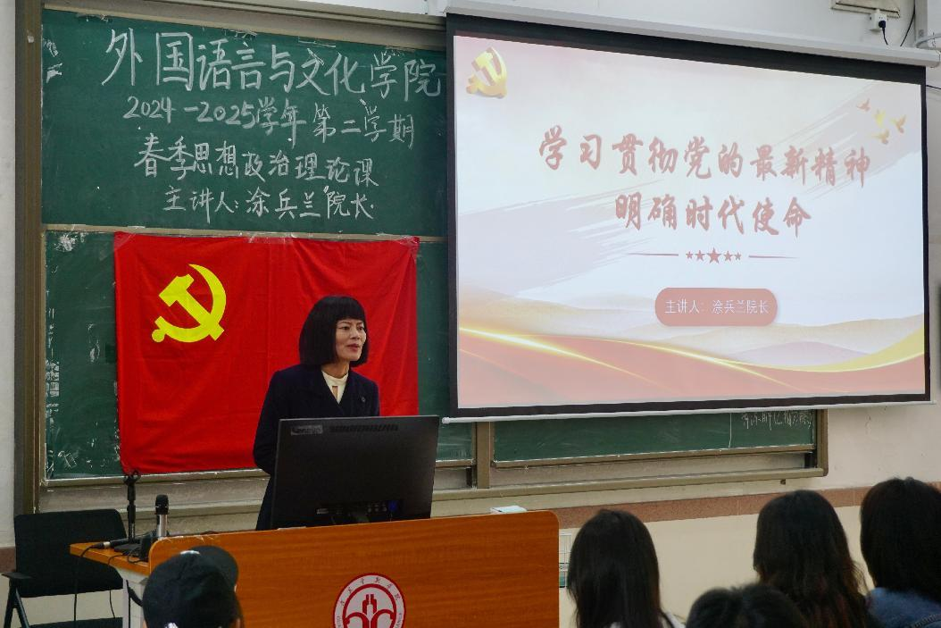 为学习贯彻党的最新精神,明确新时代青年学生的使命与担当,近日,外文学院涂兵兰院长和黄庆雄书记分别为不同群体的学生开讲2025年春季“思政第一课”,这对我院学生的思想政治教育和未来发展方向有着积极的引导意义。