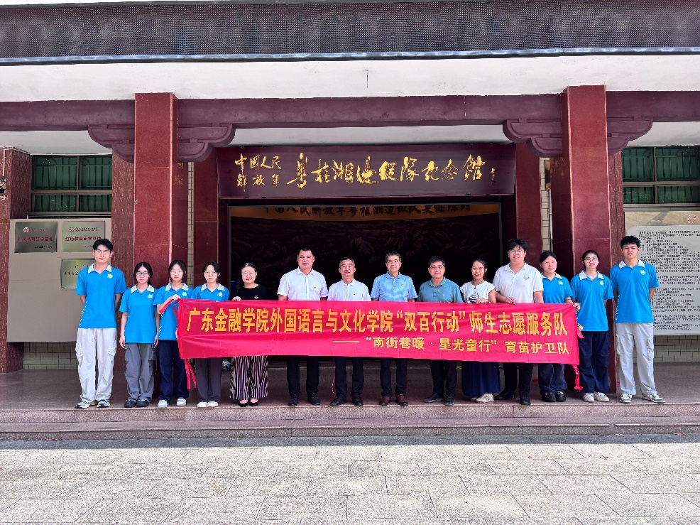 2025年7月16日,yl9193永利集团党委带领学院“双百行动”师生志愿服务队携手校友工作办公室、就业研究院、广金“双百行动”驻广宁服务队前往肇庆红色教育基地——粤桂湘边纵队纪念馆开展主题为“缅怀革命先烈 弘扬革命精神”的党日活动。校友办公室主任赖志成、就业研究院执行院长曾英杰、广金“双百行动”驻广宁服务队队长陈福盛、yl9193永利集团党委书记黄庆雄、副书记王丹、党委委员邓伟琦老师、外文学院“双百行动”实践活动指导老师孙嘉程以及志愿服务队成员参加了此次活动。