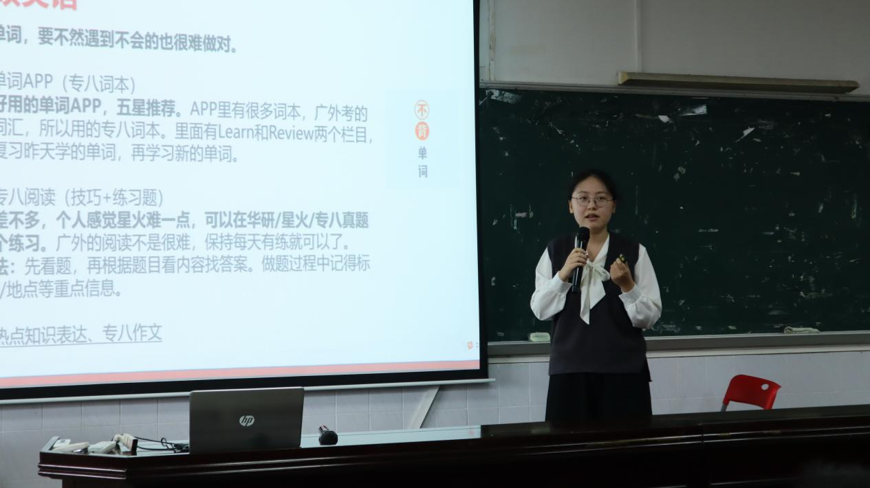 随后,来自北京燕兴国际教育咨询有限公司的邹景斌老师对同学们进行了境外升学规划指导。洪溪珧副院长对上岸考生表达了衷心的祝贺,她强调明确目标、坚持不懈和努力奋斗的重要性,并提醒同学们要不畏考研的辛苦,调节心态,以最好的状态迎接考试。