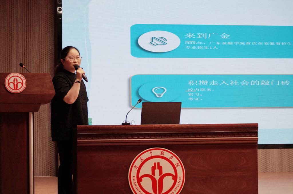 动员会首先邀请我院2008届校友、海通证券顺德营业部营销总监宋燕飞作从外语到证券的职业历程分享。宋总从入学初到广金,到第二次高考,积极参加校内外实习实践,积攒走入社会的敲门砖,到踏进社会等四个方面为大家分享了自己“英语+金融”的职业励志历程,鼓励学弟学妹们把握机会,积极充实自己,发挥优势,做最好的自己。