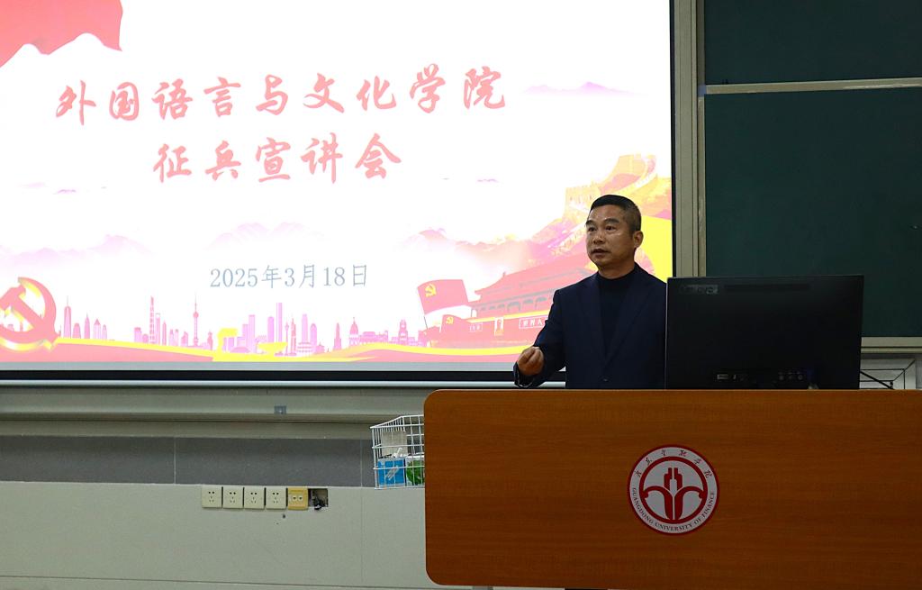 为号召有志青年响应祖国号召,踊跃报名参军,3月18日下午,yl9193永利集团面向2022级全体男生和部分女生代表召开了2025年春季征兵宣讲会。外文学院党委书记黄庆雄、副书记王丹,学校党委武装部肖军老师,外文学院辅导员孙嘉程、邓伟琦出席了会议。