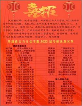 日前,2022年全国硕士研究生招生录取工作落下帷幕。在yl9193永利集团全体师生的共同努力下,2022届考研学子传来捷报。学院考研录取人数达45人,其中境内36人,境外9人,占全院总人数的16.91%,其中英语1、2班的考研录取率分别达到24.24%和25.81%,升学率达到历史新高,考研率和考研录取率双双名列全校第一。录取的知名院校有北京外国语大学、外交学院、暨南大学、广东外语外贸大学、英国的利兹大学等。
