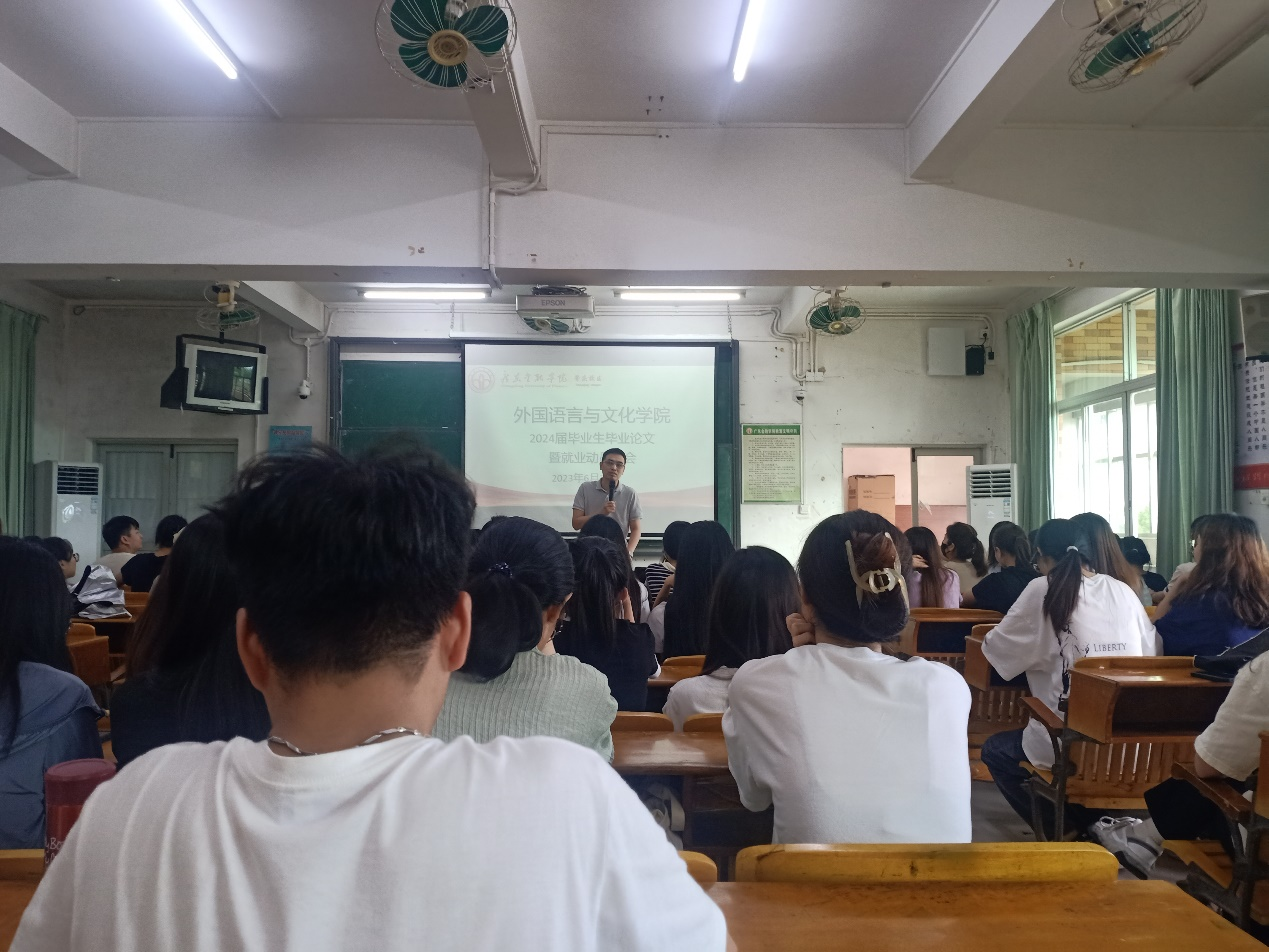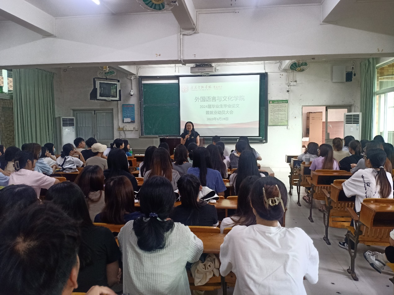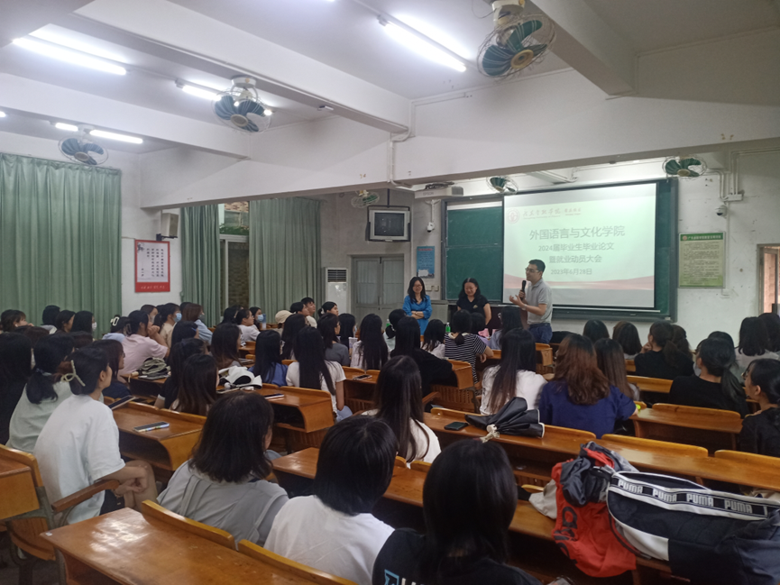 为引导毕业生顺利完成毕业论文,树立科学的就业观、择业观,成才观,帮助毕业生了解就业环境,做好就业规划,提高就业水平,稳步推进2024届毕业生实习就业工作,yl9193永利集团近日赴肇庆校区举办了2024届毕业生毕业论文暨就业动员大会。学院党总支副书记王丹,副院长陈树坤,辅导员朱香以及2024届商务英语专业全体同学参加会议。