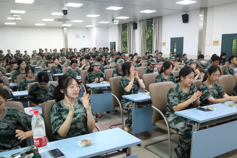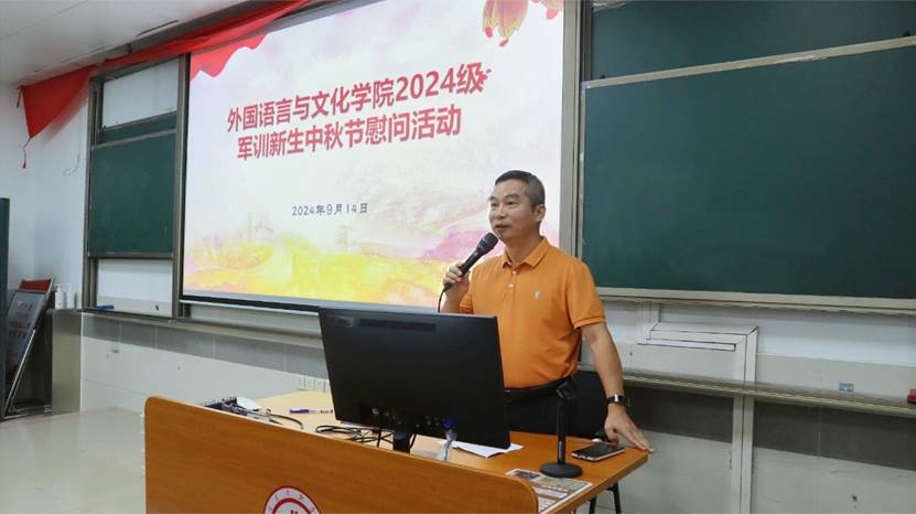 活动当天,学院精心准备了300份月饼,每一份都承载着学院对2024级学子们的美好祝愿。在慰问仪式上,黄庆雄向全体外文学院2024级新生致以节日的问候和祝福,并高度赞扬了新生们在军训中的优异表现和顽强拼搏的精神。同时,他强调中秋节是中华民族的传统节日,是团圆和亲情的象征,希望学子们能够在这个特殊的日子里,感受到来自学院大家庭的温暖和关爱。他鼓励学子们要继续发扬军训中的优良作风,努力学习专业知识,为将来成为国家的栋梁之才打下坚实的基础。陈树坤副院长则全程用英文与新生交流了军训的意义,军训能为新生带来使命感(purpose),归属感(belonging),和不一样的经历(story),更能为每一位新生带来超越感(transcendence)。