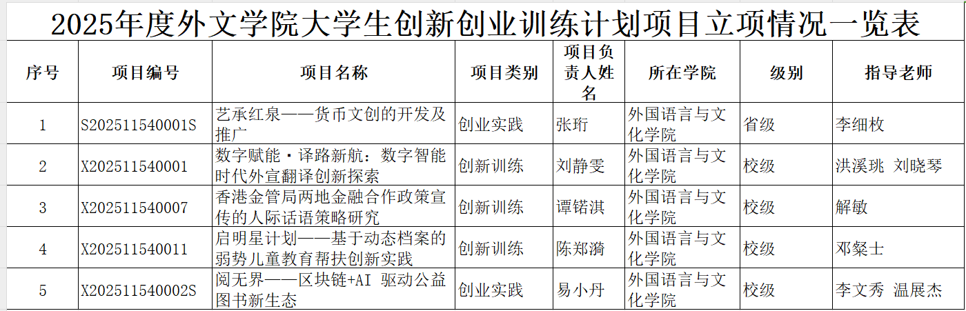 近日,2025年度大学生创新创业训练计划项目立项名单揭晓。本次外文学院共有5 个项目成功入选,涵盖创新训练与创业实践两类,展现出学院学子结合专业特色、关注社会议题的创新探索精神。