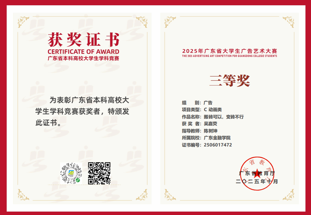 我院外文专业学生吴嘉荧(221598318),依托“外语+创意”跨学科优势,将语言表达特色融入动画广告创作,其作品《搬砖可以,变砖不行》凭借双语创意内核与鲜活视觉呈现,在广告组别C动画类竞赛中脱颖而出,最终斩获广东赛区三等奖。这一成果,既是我院“外语+实践”跨学科人才培养模式的生动实践——通过鼓励学生将外语专业能力与广告创意、数字技术结合,打破学科壁垒;也印证了外文专业学生在多元创意领域的潜力,为我院深化跨学科教学提供了实践样本。