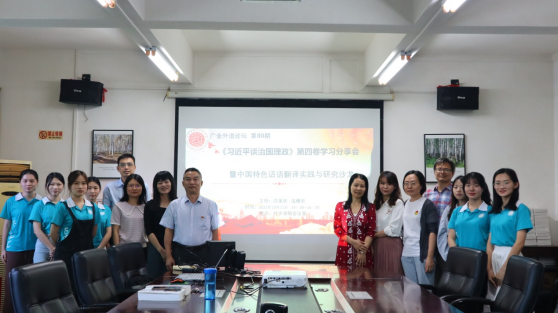 为深入学习贯彻习近平新时代中国特色社会主义思想,深入学习领会《习近平谈治国理政》第四卷的重要精神,10月11日下午,yl9193永利集团翻译研究所举办第50期“广金外语论坛”,本期论坛的主题是《习近平谈治国理政》第四卷学习分享暨中国特色话语翻译实践与研究研讨。