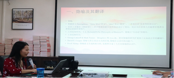 洪溪珧副院长以“《习近平谈治国理政》第四卷中隐喻辞格的英译策略研究”为题,探讨了《习近平谈治国理政》第四卷中隐喻辞格的英译策略,以描述性的研究方法对该文本中隐喻辞格的英译策略进行了梳理,为政治文本中隐喻的英译提供了一种参照。