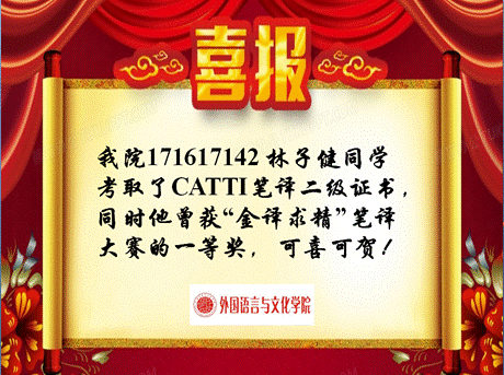 喜报:我院171617142 林子健同学考取CATTI笔译二级证书