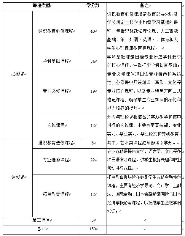 2、毕业最低学分为150学分,其中第一课堂145学分,第二课堂5学分。学生完成日语专业人才培养方案规定的课程和150学分要求,考核合格,准予毕业。符合规定条件的,授予文学学士学位。