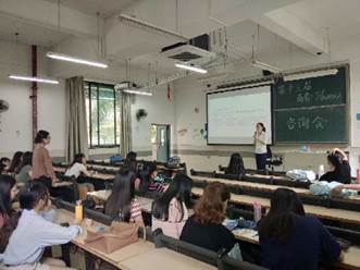 日前,本次大赛的短信、微信、现场报名平台及通道均已开通。4月9日中午,在北教学楼举行了首场咨询会。本届大赛的的主要负责同学和商务英语系教师为同学们进行了宣讲、答疑。咨询会现场气氛非常热烈,初步展示出选手们很多颇具新意的商业策划灵感。