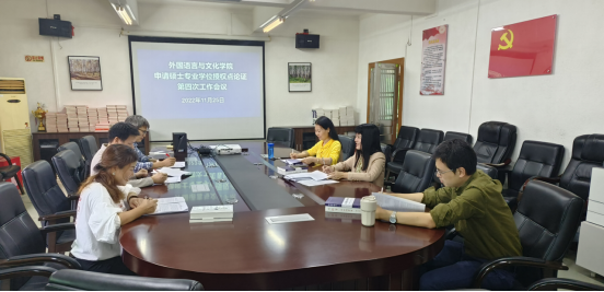 2022年11月25日上午10:00,我院MTI申硕工作小组在会议室召开第四次例行会议。涂兵兰院长带领小组成员,对照《专业学位审核基本条件》,对最新填写的申报书版本做了全面细致的审读和校对,就特色突显、数据更新、文字润色、排版格式等细节做了仔细斟酌和深入考究。