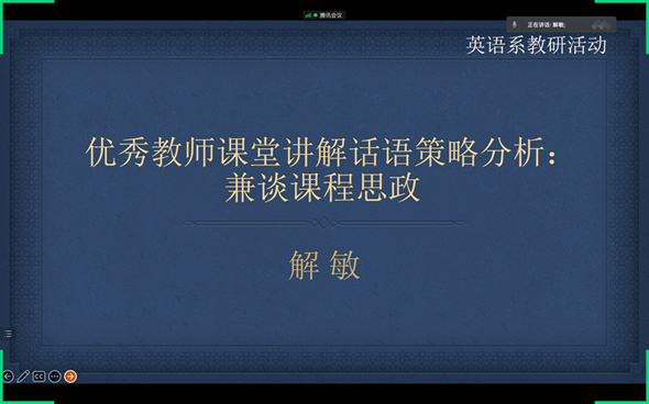 12月16日周五下午5:00,英语系通过腾讯会议举办了本学期教研活动。本次活动致力于推动学院下达的课程思政任务,为教学文件更新、切实落实课程思政,提供思路和方法。活动围绕解敏博士所作的报告展开,报告题为:优秀教师课堂讲解话语策略分析——兼谈课程思政。