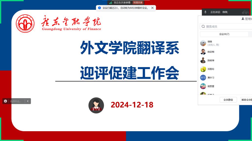 12月18日,外文学院翻译系召开全系大会,围绕学校即将到来的本科教育教学质量评估、期末考试工作、年终考核评估等一系列关键议题进行了工作部署,也对下学期工作进行了规划展望。会议由翻译系主任邓薇主持,全体教师线上参会。