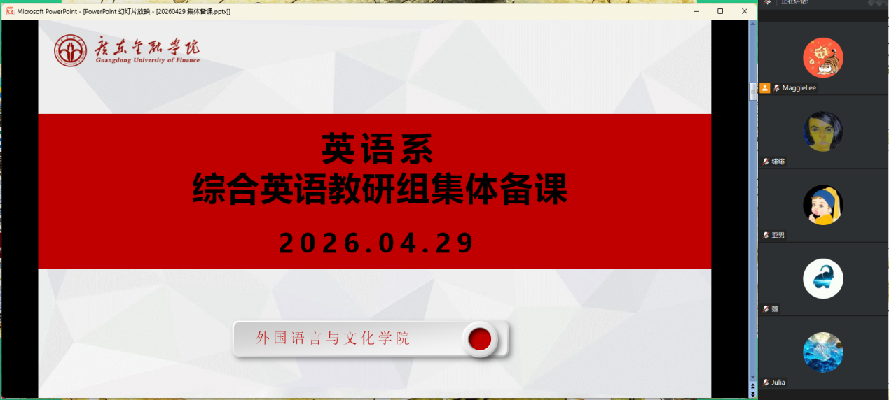 为深入推进本科教育教学审核评估整改工作,落实学校“2026年本科教育教学质量月”活动要求,进一步提升课程建设水平与课堂教学质量,英语系综合英语教研组于2026年4月29日召开集体备课会,围绕期中教学检查、期末考试命题及BOPPPS教学模式学习与后续试行安排等内容进行了集中研讨与部署。