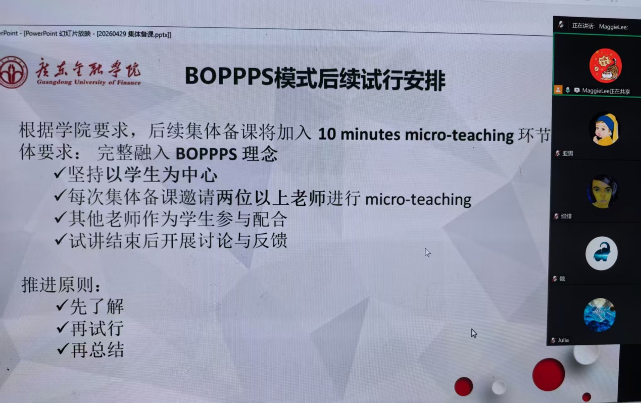 会议同时明确,后续集体备课将逐步引入“10 minutes micro-teaching”环节,由两位以上教师围绕具体教学内容进行微型试讲,其他教师模拟学生参与课堂活动,并在试讲结束后开展集中反馈与研讨。相关试讲将完整融入BOPPPS理念,坚持以学生为中心,按照“先了解、再试行、再总结”的思路稳步推进。教研组将结合具体课例,逐步探索BOPPPS模式与综合英语课程教学实际的融合路径,推动教学研讨从经验交流走向课堂实践。