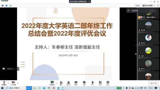 2022年12月16日,大学英语教学一部和二部分别举行线上期末工作总结会议。会上,教学部主任车春柳副教授对长期支持大学英语部工作的各位老师表示衷心感谢。在过去一年里,教学部全体老师为全校大学英语的教学工作以及大学英语部的发展做出了重要贡献。大学英语部的发展和进步,离不开老师们的认真负责、爱岗敬业。