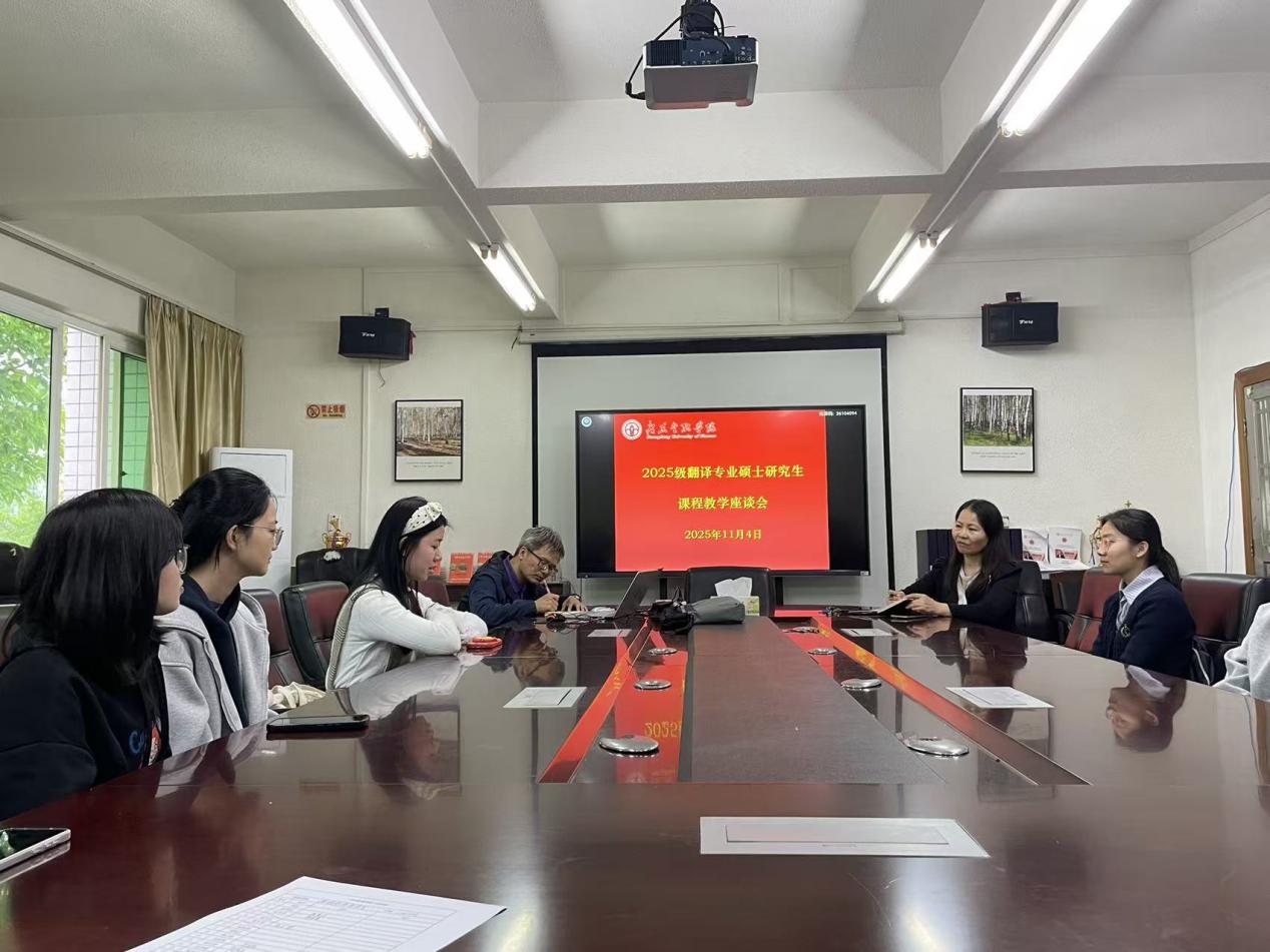 2025年11月4日中午,我院在会议室召开翻译专业硕士课程教学座谈会。会议由学院副院长洪溪珧主持,翻译学位教育中心主任刘传江及2025级全体研究生参会。
